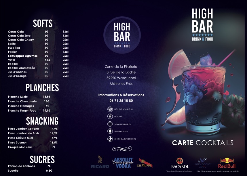 5 cl de Rhum Bacardi Anejo 4 ans, 2,5 cl de Crème de Framboise, Purée de Passion, Citron vert, Jus d’Ananas.